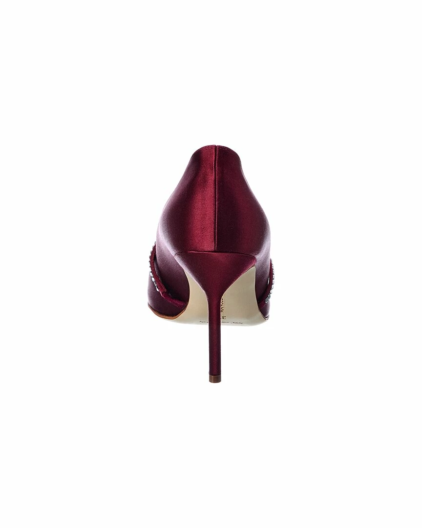 - Crina 90 Satin Pump In Dark Red Satin With Crystal-Embellished Strap And Pointy-Toe