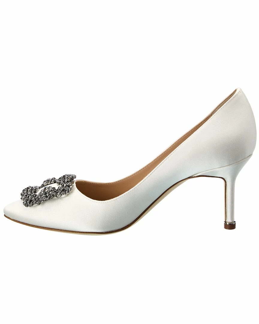 - Hangisi 70 Satin Pump In White Satin And Gunmetal-Tone Hardware With Crystal Buckle